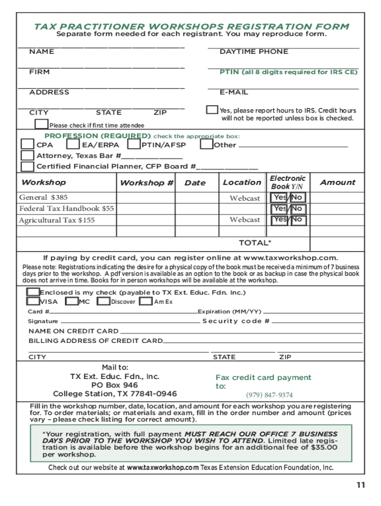 This form is used to register for tax practitioner workshops, requiring separate forms for each registrant. It includes fields for personal information, profession, workshop selection, and payment