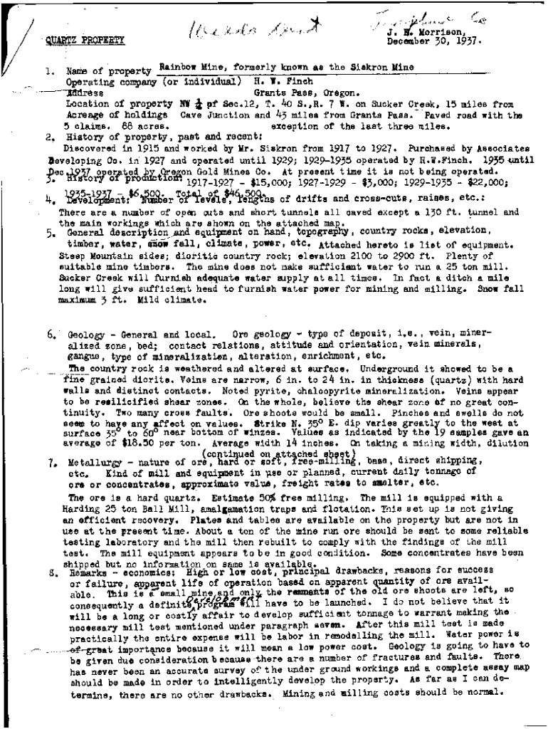 This document provides a comprehensive report on the Rainbow Mine, detailing its history, geology, equipment, and assay results. Originally discovered in 1915, the mine has undergone various operations