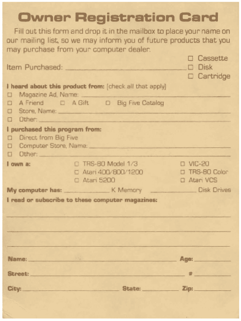 Fill out this form and drop it in the mailbox to place your name on our mailing list, so we may inform you of future products that you may purchase from your computer dealer.
