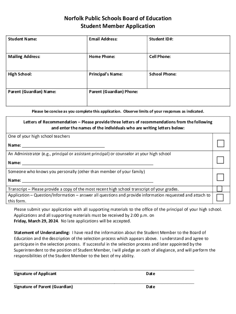 Este documento proporciona información y un formulario de solicitud para que un estudiante de secundaria de Norfolk se postule como representante estudiantil ante la Junta de Educación. Incluye