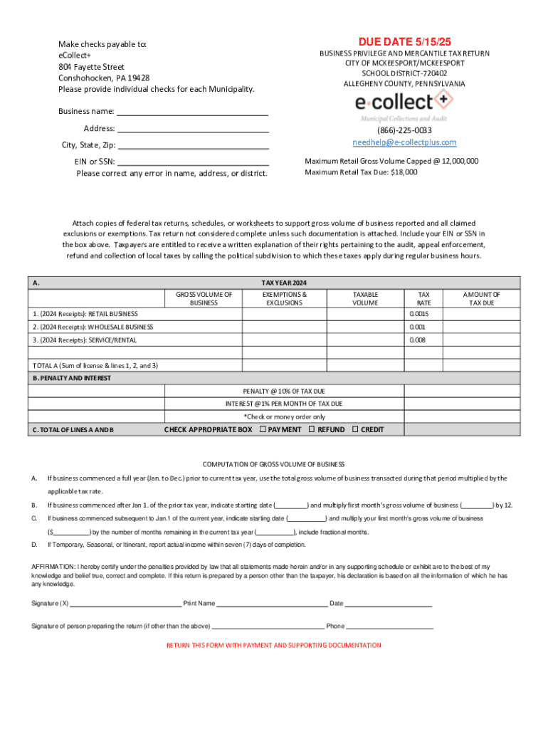 This document is a tax return form for business privilege and mercantile tax in McKeesport, Pennsylvania. It requires businesses to declare their gross volume of business and calculate the taxes due