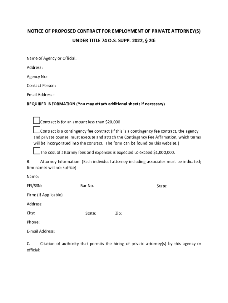 This document serves as a notice for agencies or officials to propose contracts for hiring private attorneys in compliance with Title 74 O.S. Supp. 2022, § 20i. It includes sections for attorney