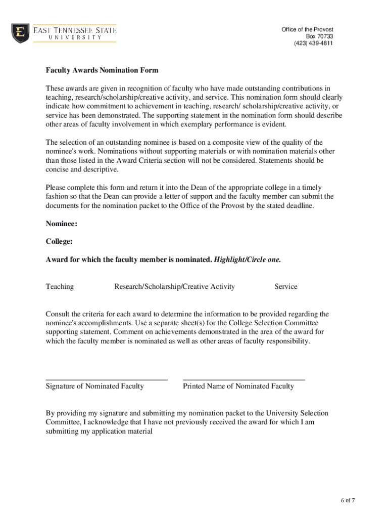Faculty Awards Nomination Form is not the form you're looking for?Search for another form here.