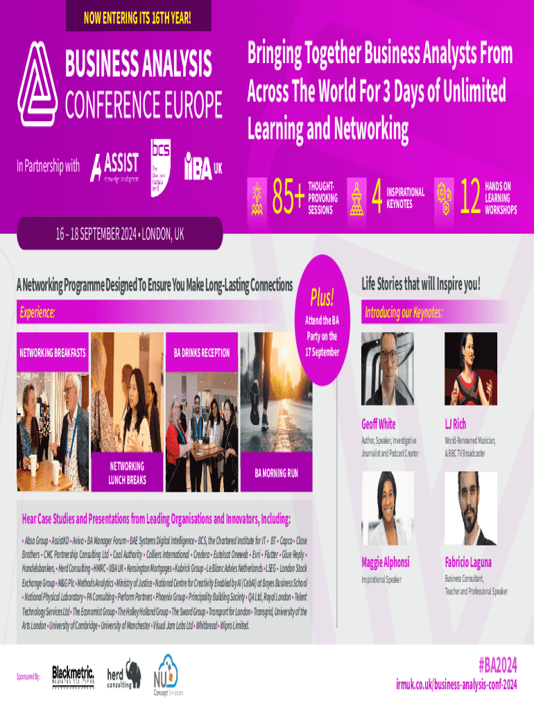 NOW ENTERING ITS 16TH YEAR!In Partnership with 16 18 SEPTEMBER 2024 LONDON, UKBringing Together Business Analysts From Across The World For 3 Days of Unlimited Learning and Networking85+A Networking