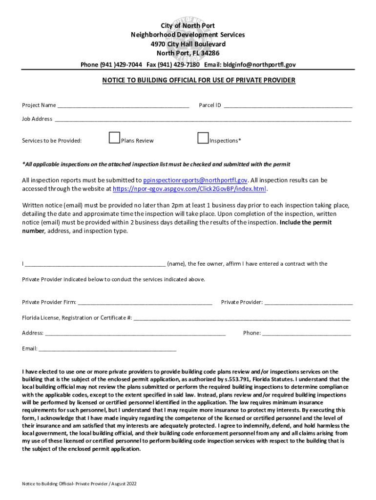 This document is a notice template for the use of a private provider for building plan review and inspections in North Port, Florida. It outlines the requirements for submission of inspection reports