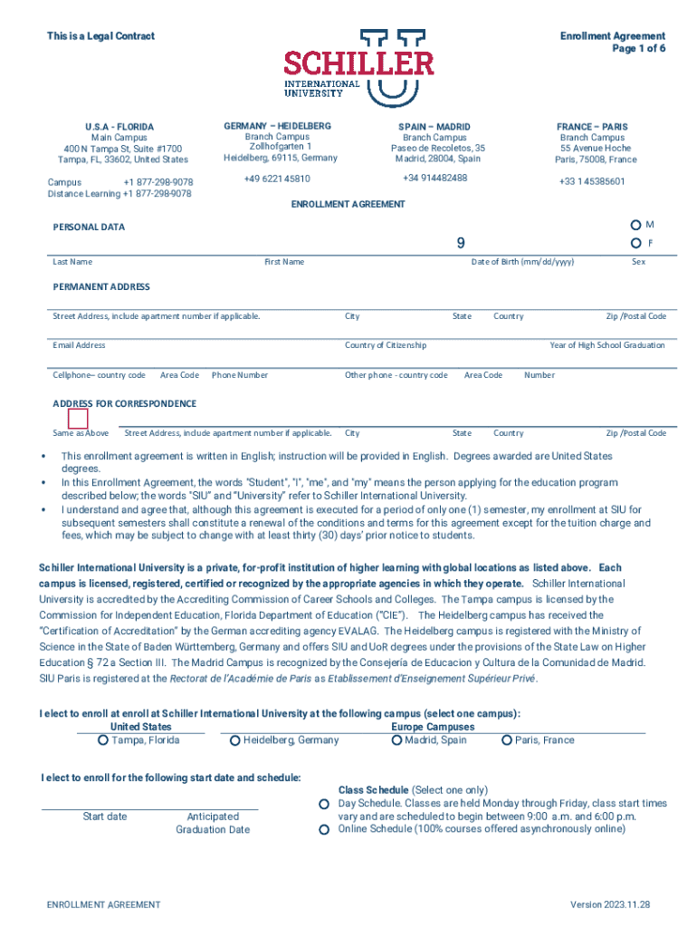 This document serves as a legal contract for enrollment at Schiller International University, detailing campuses, personal data requirements, tuition fees, program options, payment plans, and cancellation