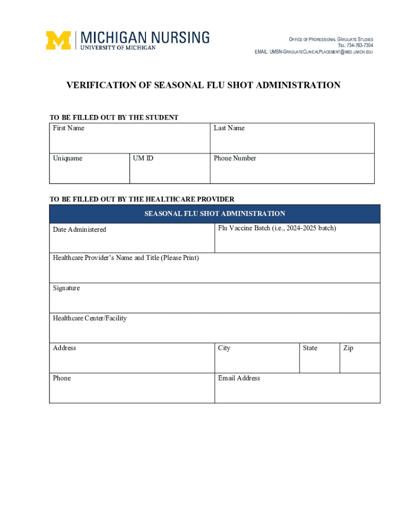This form is used by students to verify the administration of seasonal flu shots by healthcare providers. It includes sections for student information and healthcare provider details.