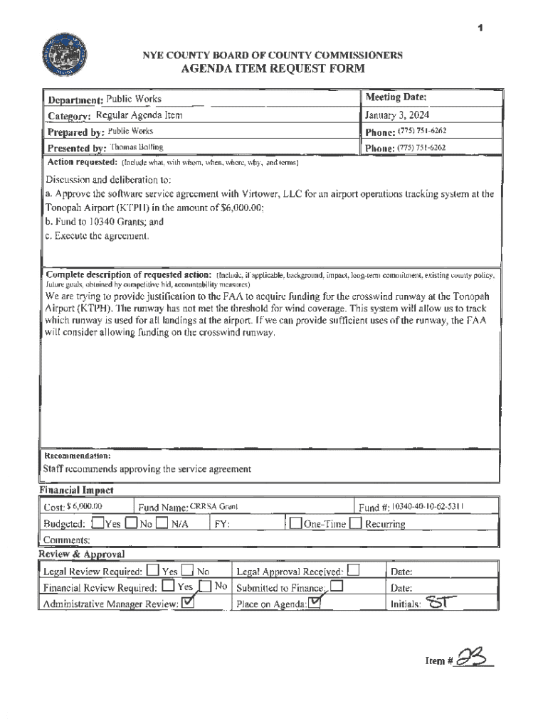 Discussion and deliberation to approve the software service agreement with Virtower, LLC for an airport operations tracking system at the Tonopah Airport (KTPH) in the amount of $6,000.00. The system