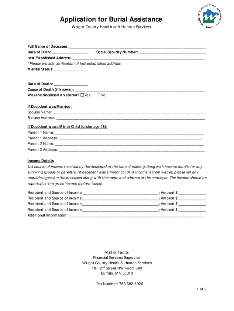 This document is used to apply for burial assistance from Wright County Health and Human Services. It requires details about the deceased, financial information, and funeral services requested.