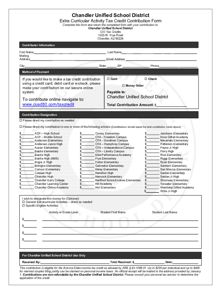 This form allows contributors to donate to extracurricular activities within the Chandler Unified School District, specifying how their contribution should be designated and processed.