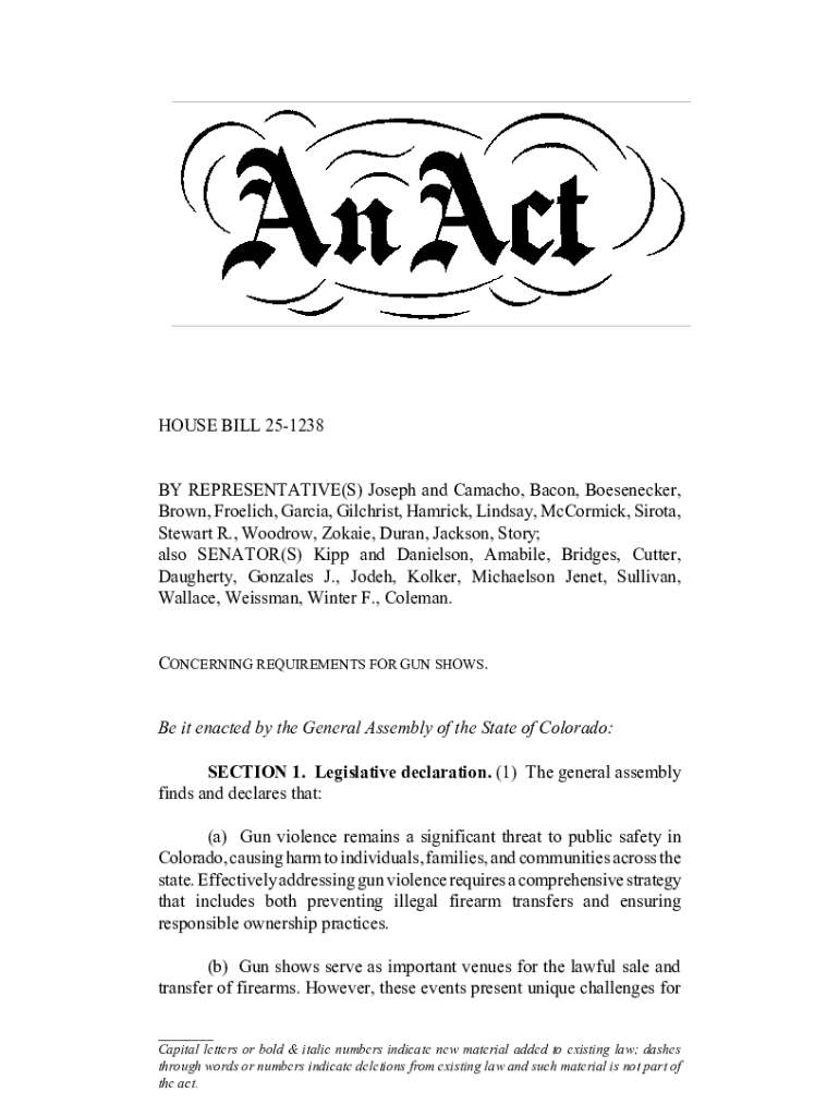 This bill outlines the requirements and regulations for gun shows in Colorado, aiming to address gun violence and promote responsible firearm ownership through security measures, background checks,