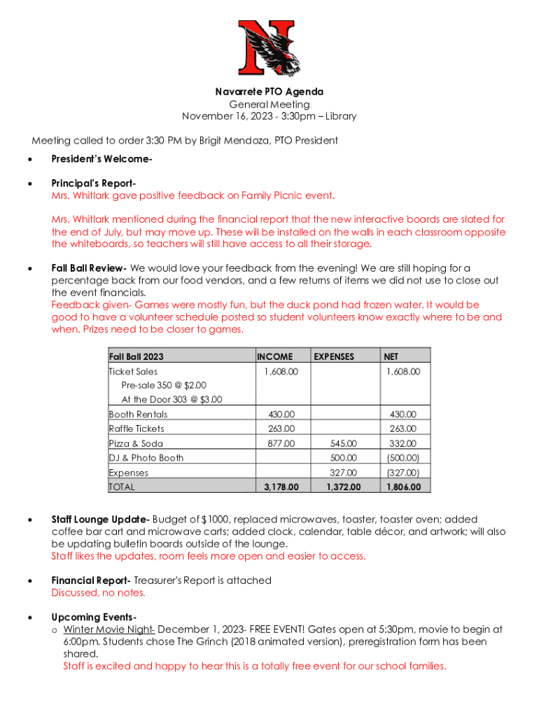 This document outlines the agenda for the Navarrete PTO General Meeting held on November 16, 2023. It includes reports from the President and Principal, financial updates, event reviews, and plans