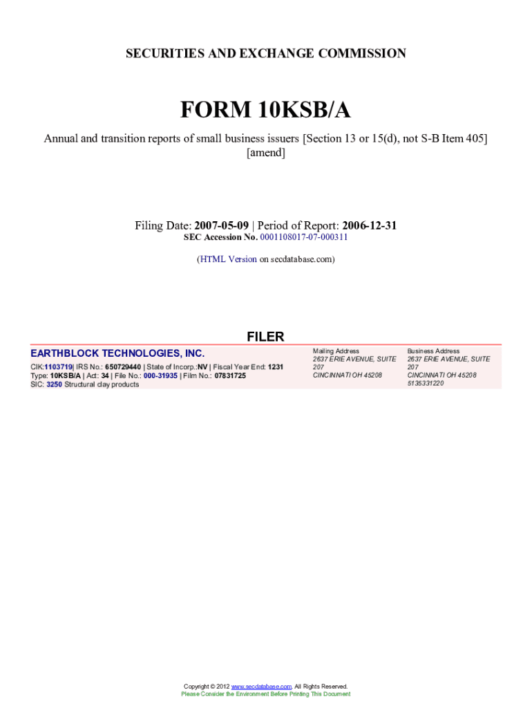 This document is an amended annual report submitted by EarthBlock Technologies, Inc. to the SEC. It contains financial information, business operations, and disclosures required under the Securities