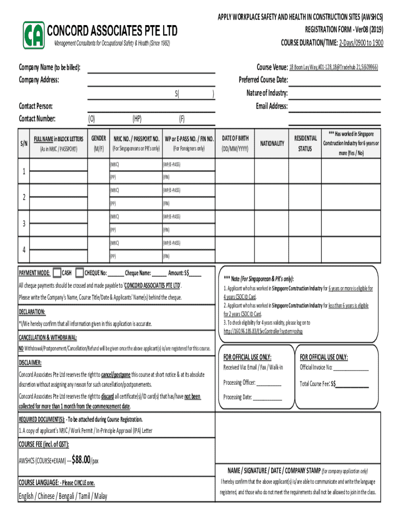 This form is for registering participants for the AWSHCS course, which focuses on workplace safety and health in construction sites. It includes pertinent details such as course duration, payment
