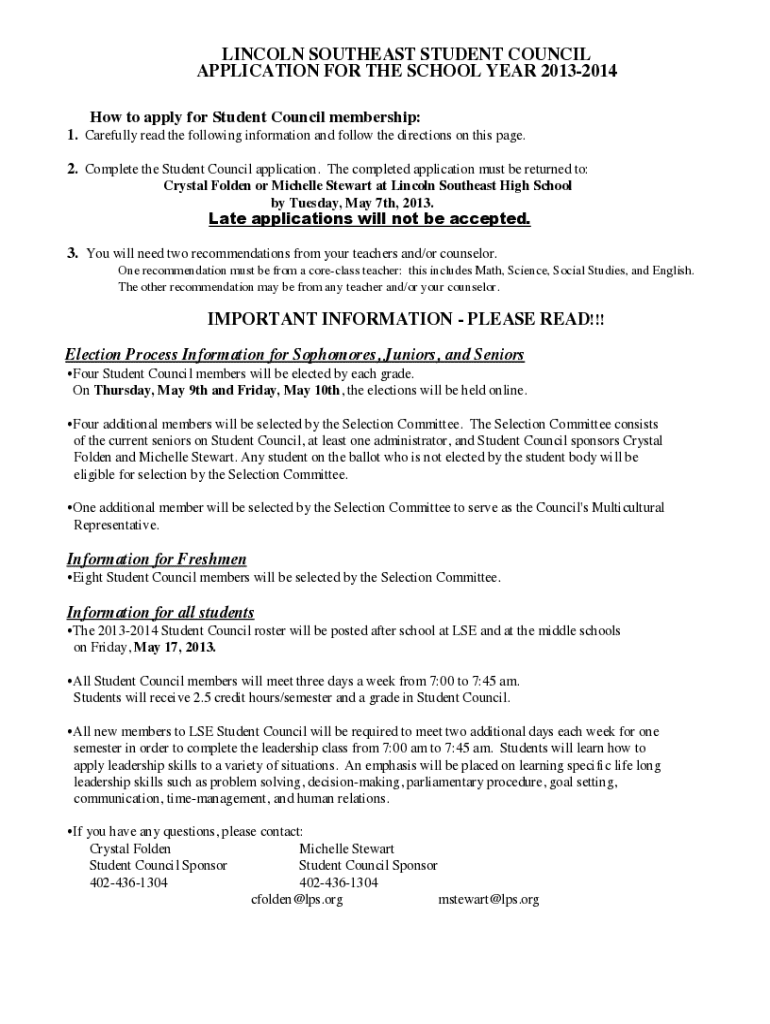 This document outlines the application process for becoming a member of the Lincoln Southeast High School Student Council for the school year 2013-2014. It includes instructions for applicants, requirements