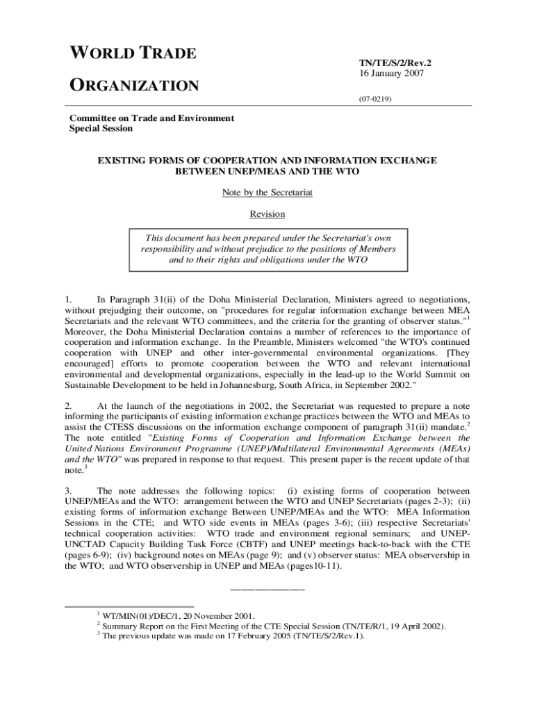 This document outlines the existing cooperation and information exchange practices between the World Trade Organization (WTO) and various Multilateral Environmental Agreements (MEAs), primarily focusing