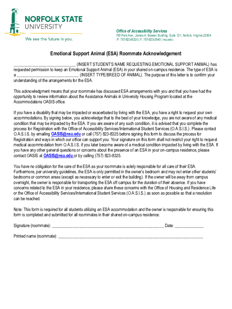 Get the free Emotional Support Animal (esa) Roommate Acknowledgement