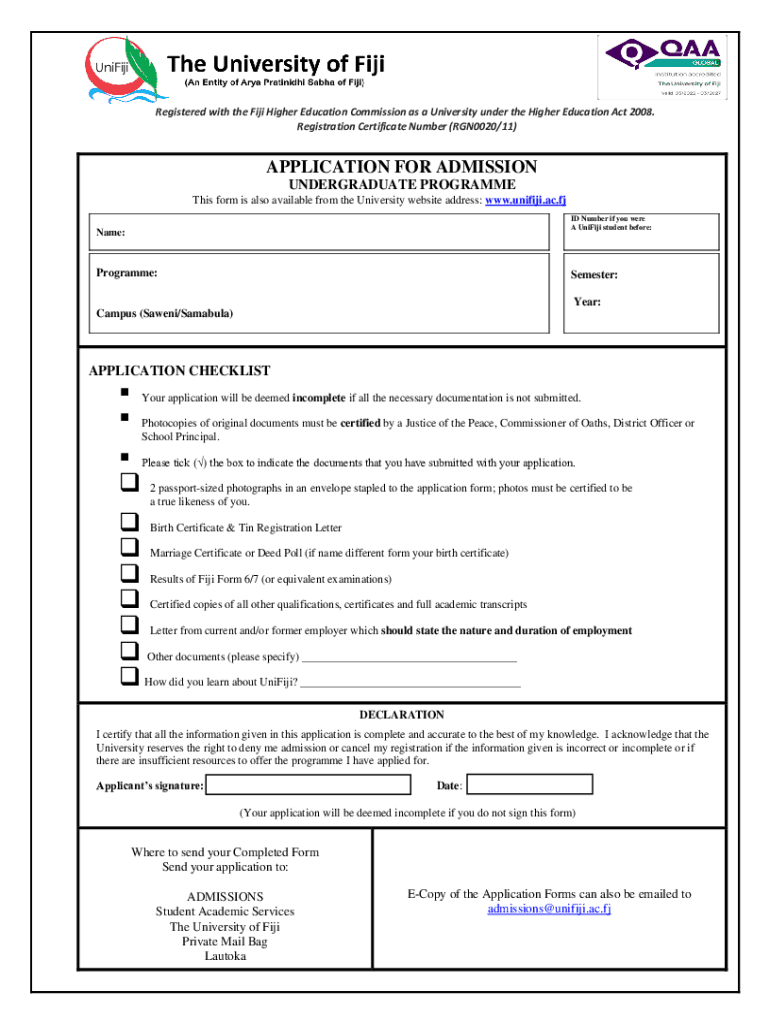 This form is used for applying to undergraduate programmes at the University of Fiji. It includes personal details, application checklist, and medical records. Applicants must submit certified copies