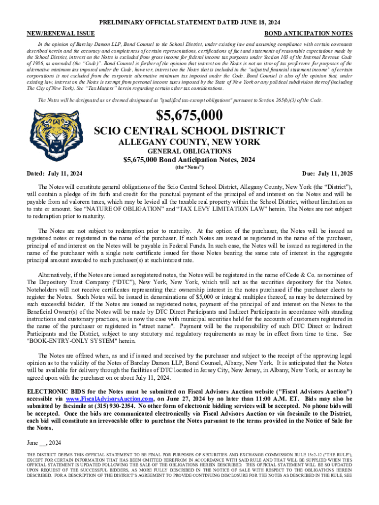 PRELIMINARY OFFICIAL STATEMENT DATED JUNE 18, 2024 NEW/RENEWAL ISSUEBOND ANTICIPATION NOTESIn the opinion of Barclay Damon LLP, Bond Counsel to the School District, under existing law and assuming