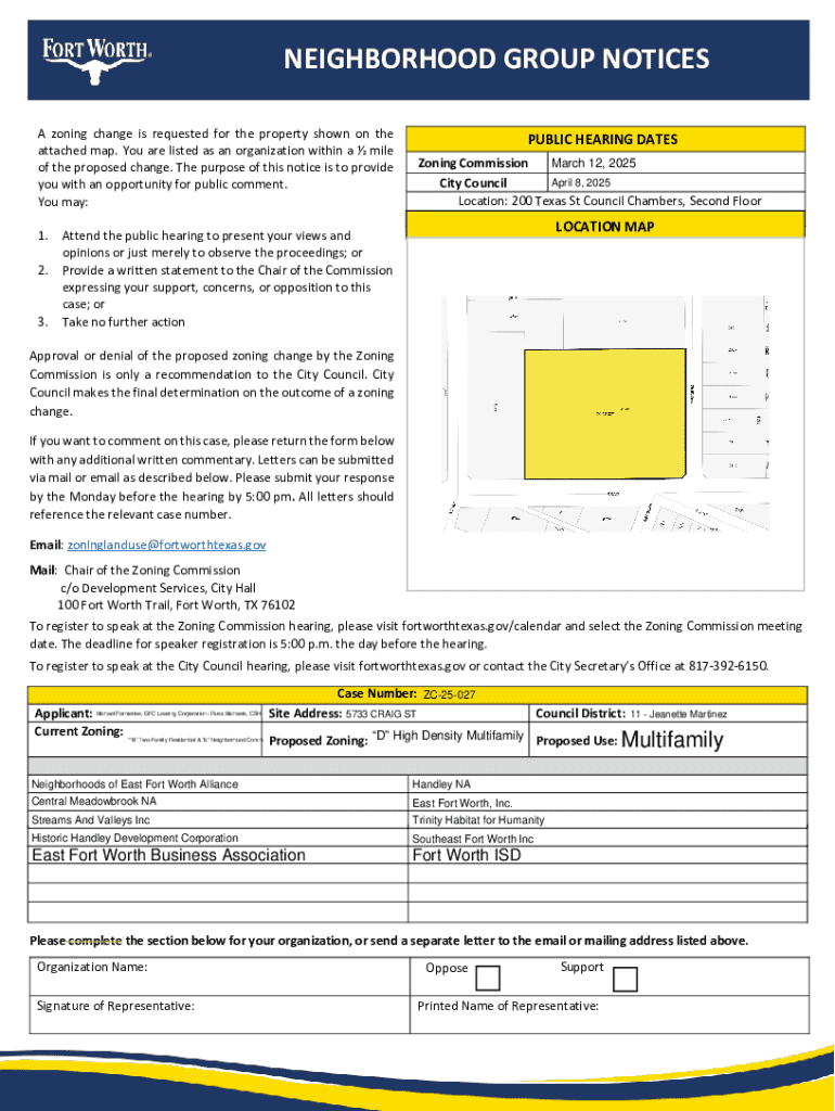 This document serves as a notification for a requested zoning change for a property, providing information on public hearings, the opportunity for public comment, and details about the proposed development