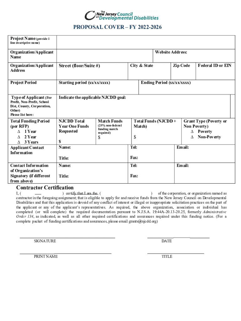 This document serves as the cover for grant proposals submitted to the New Jersey Council on Developmental Disabilities (NJCDD) for the fiscal years 2022-2026. It includes sections for project details,