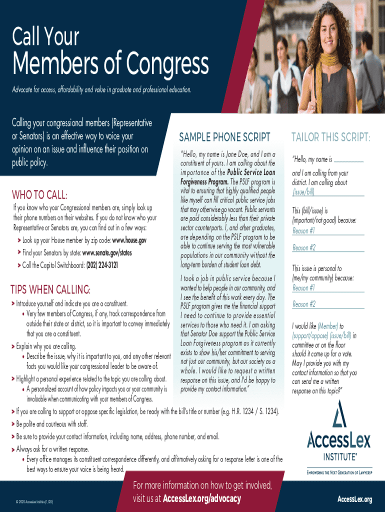 Call YourMembers of Congress Advocate for access, affordability and value in graduate and professional education.Calling your congressional members (Representative or Senators) is an effective way