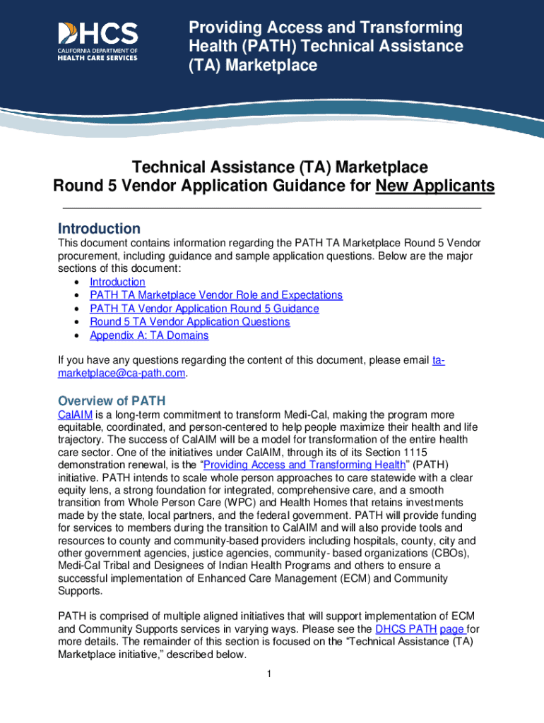 This document provides comprehensive information regarding the PATH Technical Assistance Marketplace Round 5 Vendor procurement. It includes guidance and sample application questions for potential