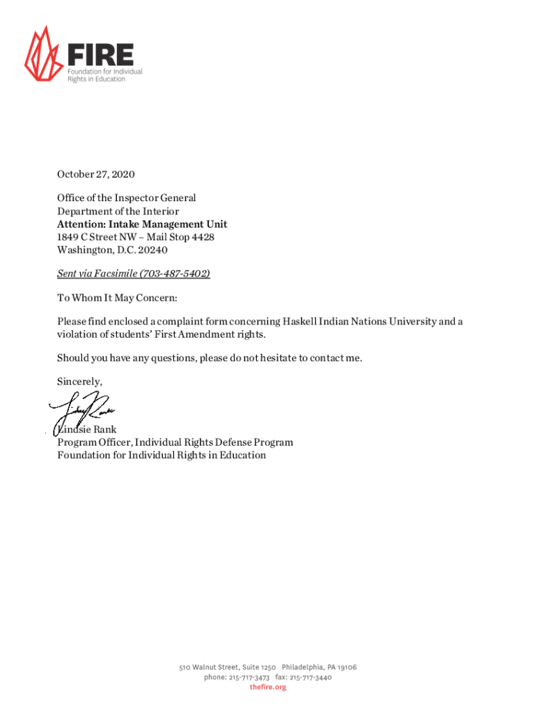 This document is a complaint form addressing a violation of students’ First Amendment rights at Haskell Indian Nations University, specifically related to the actions of President Ronald Graham