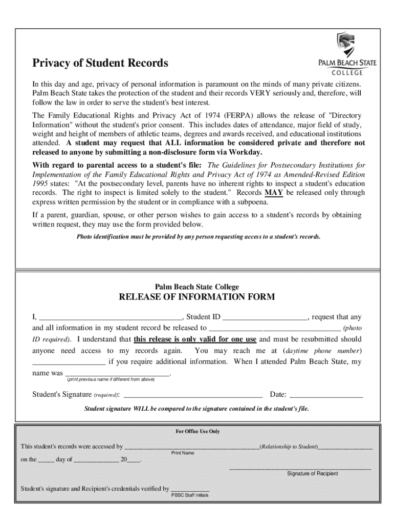 This form allows students at Palm Beach State to request the release of their student records to designated individuals. It outlines the rights under the Family Educational Rights and Privacy Act
