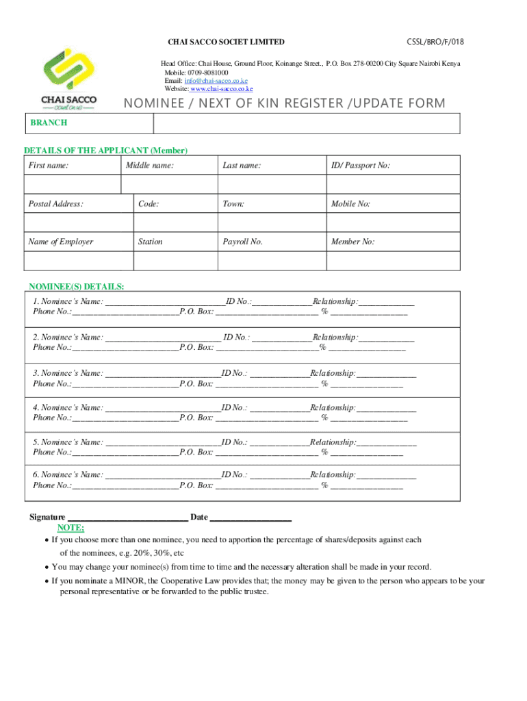 This form is used by members of Chai Sacco Society Limited to register or update their nominees or next of kin details. It requires personal information of the member as well as the details of up