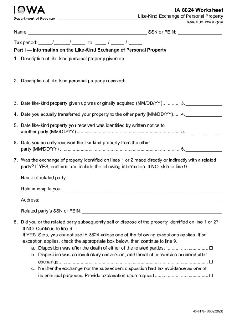 Taxpayers who engage in a like-kind exchange of property and wish to defer capital gains taxes must file the IA 8824 worksheet.
