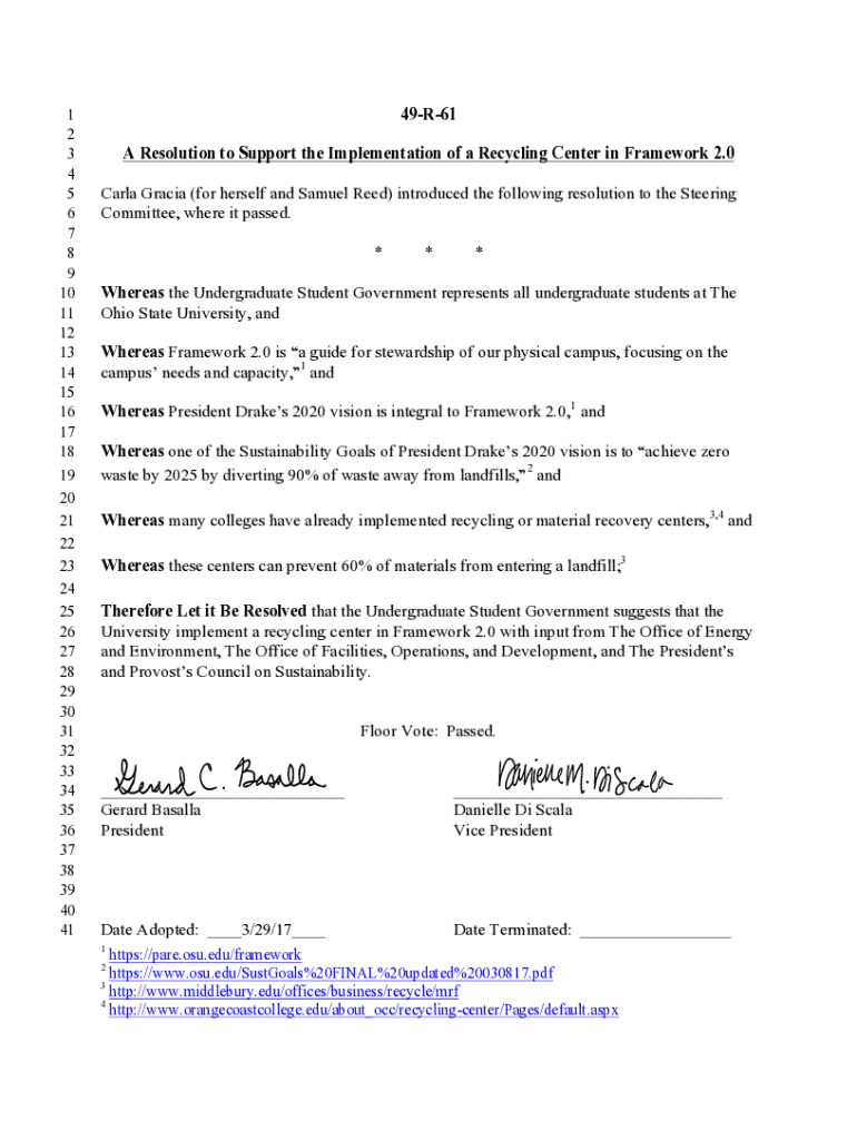 This resolution, introduced by Carla Gracia and Samuel Reed, aims to support the establishment of a recycling center within the Framework 2.0 initiative at The Ohio State University, aligning with