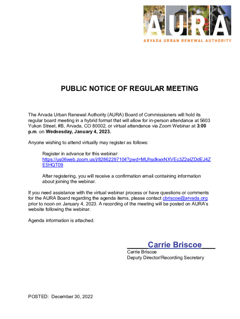 PUBLIC NOTICE OF REGULAR MEETING The Arvada Urban Renewal Authority (AURA) Board of Commissioners will hold its regular board meeting in a hybrid format that will allow for inperson attendance at