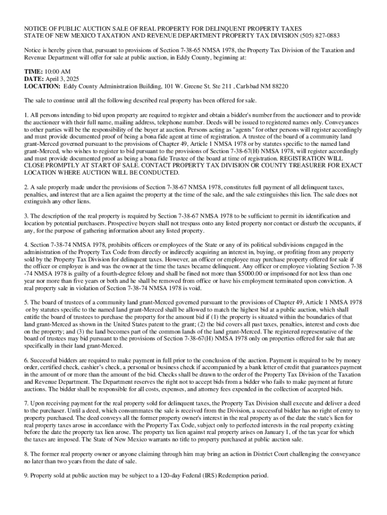 Este aviso informa que, de acuerdo con las disposiciones de la Sección 7-38-65 NMSA 1978, la División de Impuestos sobre Propiedades del Departamento de Hacienda y Rentas llevará a cabo una subasta