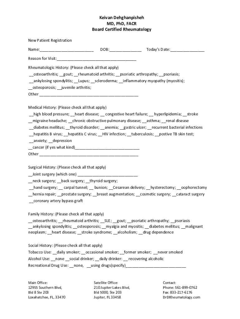 This form is designed for new patients to provide their personal, medical, and family history for rheumatology evaluation. It includes sections for rheumatologic history, medical history, surgical