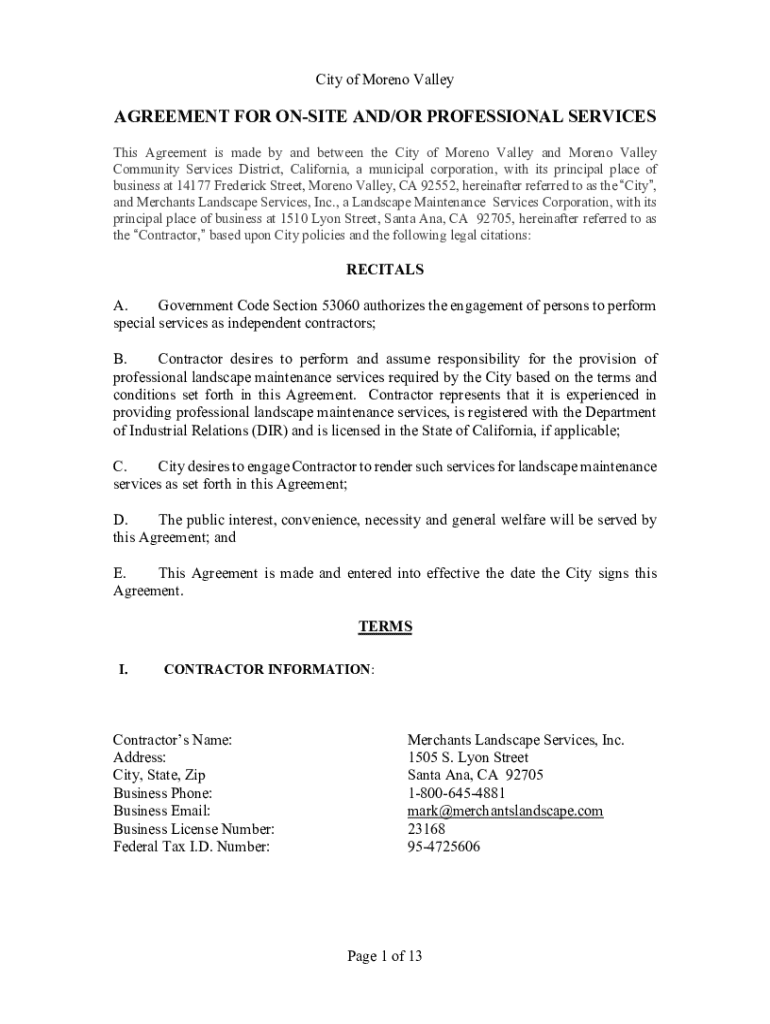 City of Moreno ValleyAGREEMENT FOR ONSITE AND/OR PROFESSIONAL SERVICES This Agreement is made by and between the City of Moreno Valley and Moreno Valley Community Services District, California, a