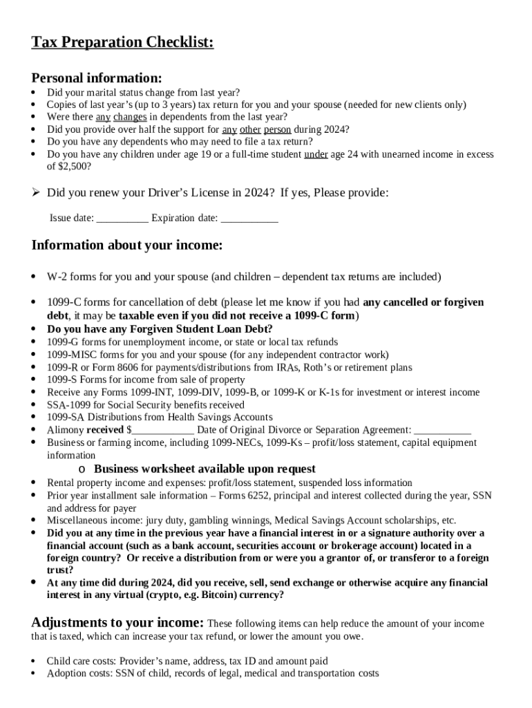The Tax Preparation Checklist is a document that has to be filled-out and signed for specified purposes. Then, it is furnished to the relevant addressee in order to provide some details and data. The completion and signing is available manually or using a trusted solution e. g. PDFfiller. Such tools help to fill out any PDF or Word file online. It also allows you to customize its appearance according to your needs and put a legal electronic signature. Upon finishing, you send the Tax Preparation Checklist to the recipient or several ones by email and even fax. PDFfiller offers a feature and options that make your blank printable. It offers different settings when printing out. It does no matter how you'll distribute a form - physically or by email - it will always look neat and organized. To not to create a new file from scratch over and over, turn the original file as a template. After that, you will have an editable sample.