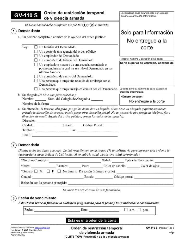 Formulario utilizado para solicitar una orden de restricción temporal en casos de violencia armada, donde se requiere la información del demandante y del demandado, así como los detalles sobre