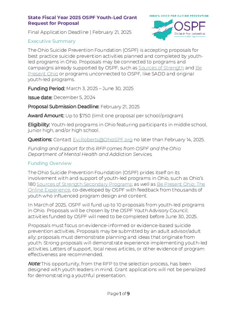 The Ohio Suicide Prevention Foundation (OSPF) is inviting proposals for youth-led suicide prevention programs in Ohio. Funding is available for up to $750 for evidence-informed activities that address