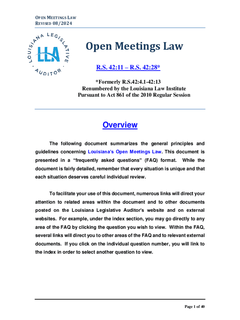 This document summarizes the general principles and guidelines concerning Louisiana’s Open Meetings Law presented in a frequently asked questions format, detailing the requirements, procedures,