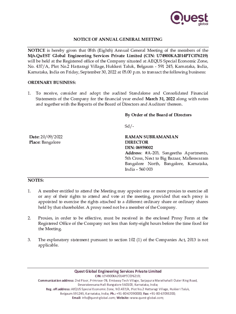 This document serves as a notice for the 08th Annual General Meeting of Quest Global Engineering Services Private Limited, detailing the date, time, venue, and agenda of the meeting, including the