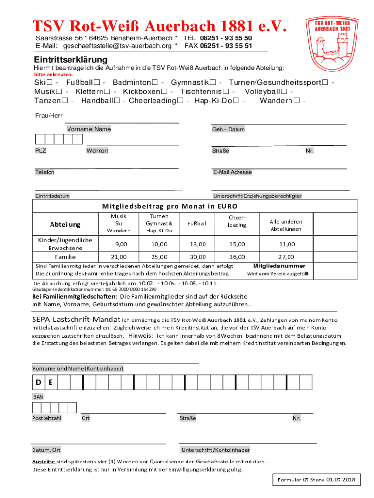Diese Eintrittserklärung dient zur Beantragung der Aufnahme in die TSV Rot-Weiß Auerbach und enthält wichtige Angaben zu Abteilungen, Mitgliedsbeiträgen sowie zur Einwilligung zur Verarbeitung