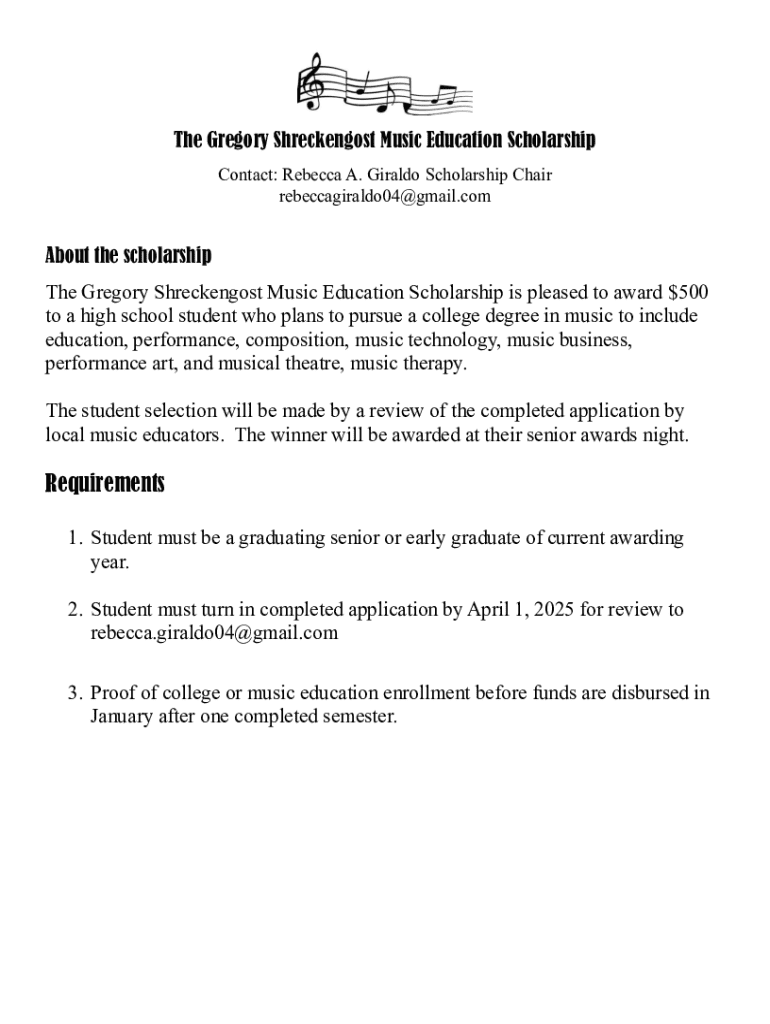 Get the free Gregory Shreckengost Music Education Scholarship Application