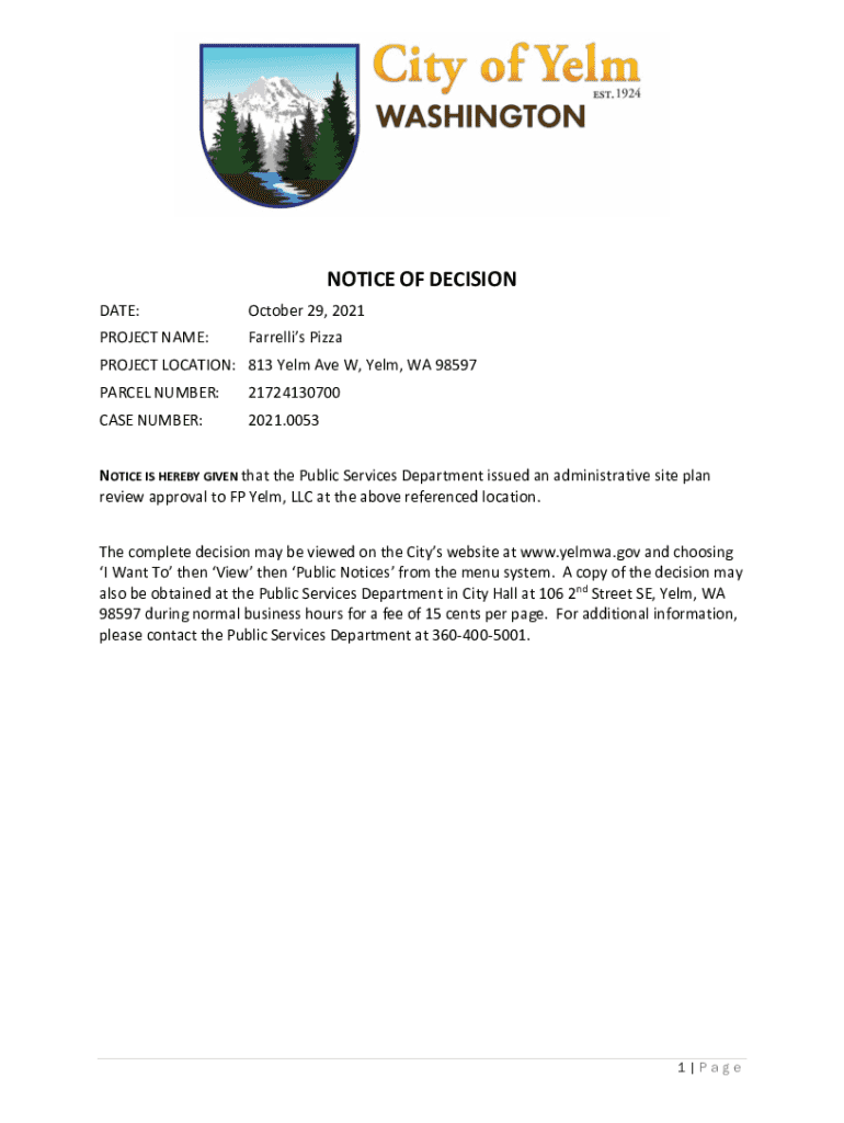 This document serves as a formal notice regarding the administrative site plan review approval for Farrelli’s Pizza at 813 Yelm Ave W, Yelm, WA. It outlines the project scope, zoning compliance,