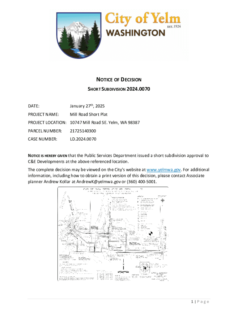 This document serves as a notice regarding the approval of a short subdivision by the Public Services Department for C&E Developments at the location 10747 Mill Road SE, Yelm, WA. It outlines the