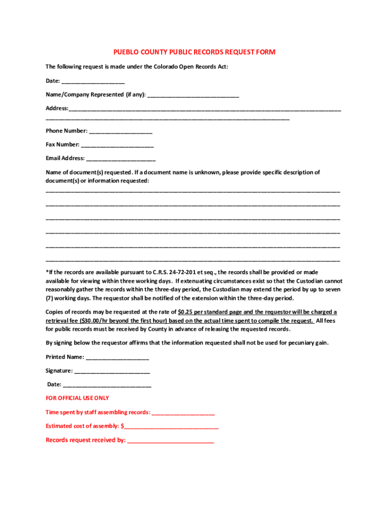 Pueblo County Public Records are documents and information created, received, or maintained by Pueblo County government departments and are available to the public under the Colorado Open Records Act.
