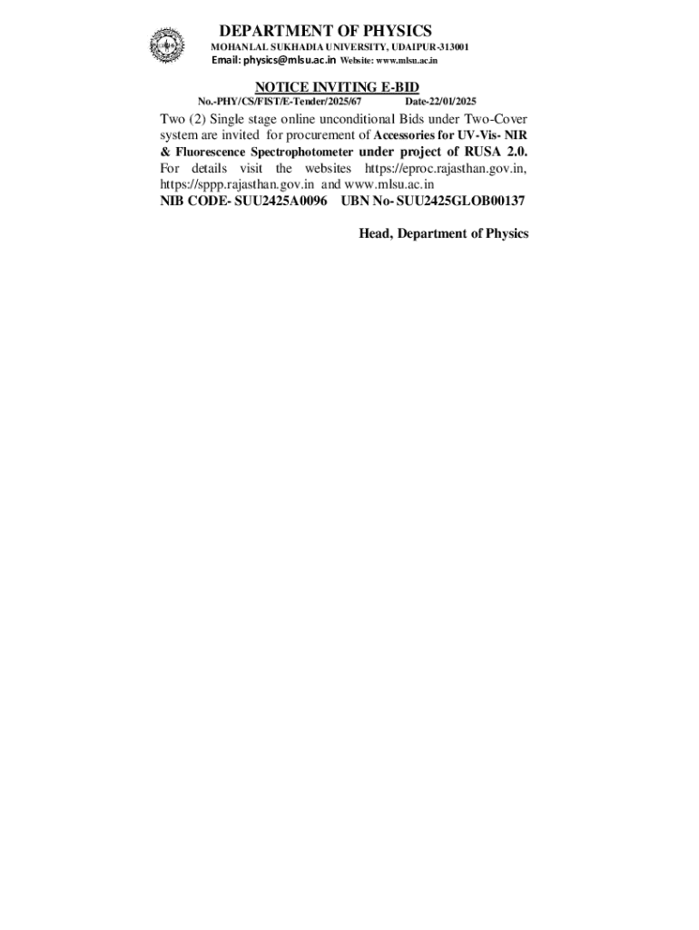 E-bid invitation for procurement of accessories for UV-Vis- NIR & Fluorescence Spectrophotometer at Mohanlal Sukhadia University, Udaipur. The document includes critical dates, submission requirements,