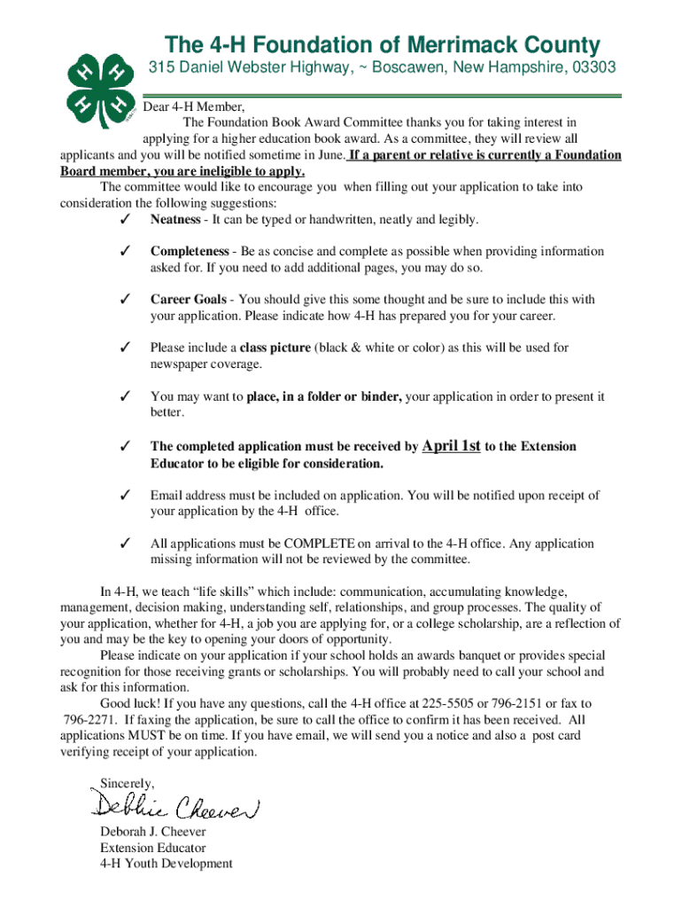 This application is for 4-H members of Merrimack County to apply for the Foundation Book Award, aimed at assisting with higher education costs. Applicants must provide personal information, career