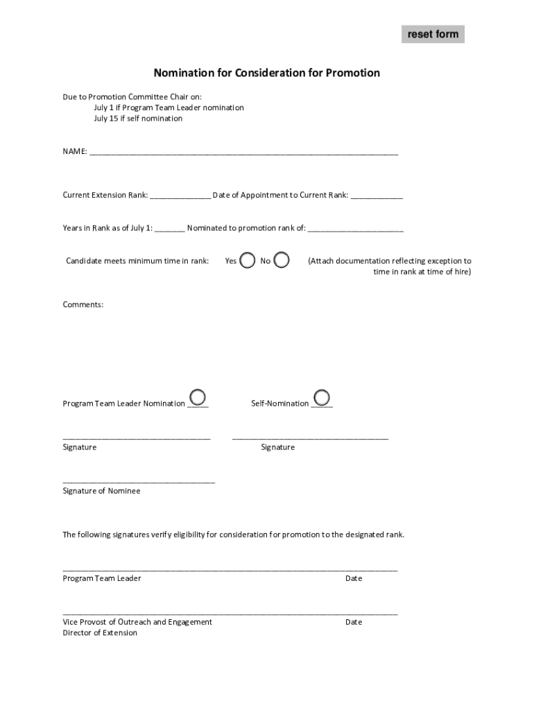 This form is used for nominating candidates for promotion within the organization, detailing the candidate\'s current rank, years in rank, and obtaining necessary signatures for eligibility.