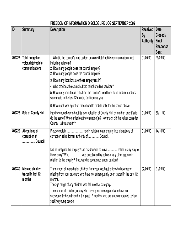 ID Summary 400227 Total budget on voice/data/mobile communications FREEDOM OF INFORMATION DISCLOSURE LOG SEPTEMBER 2009 Description 1. What is the council's total budget on voice/data/mobile communications